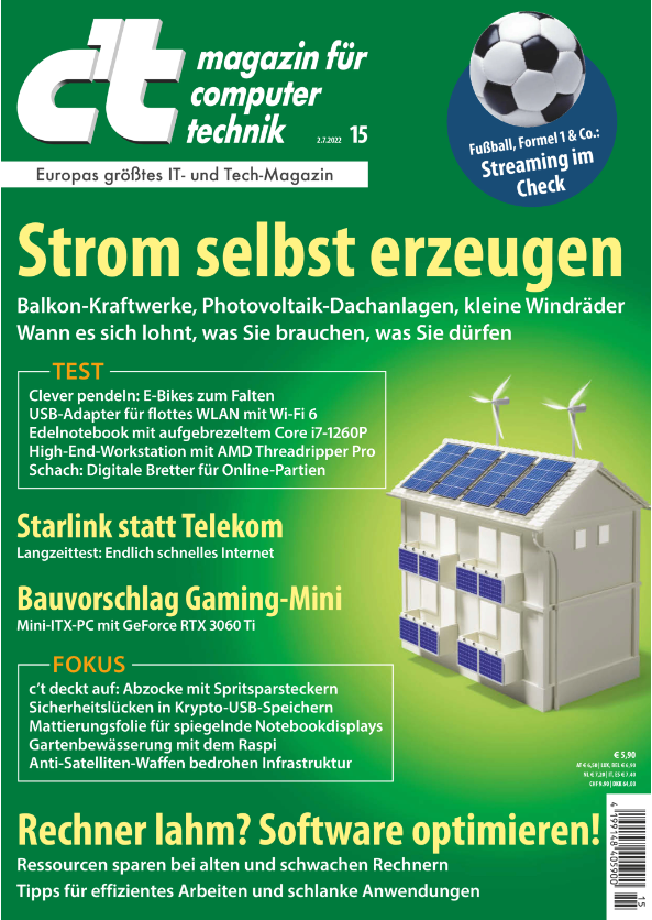 Highlights: Strom selbst erzeugen: Balkon-Kraftwerke, Photovoltaik-Dachanlagen, kleine Windräder Rechner lahm? Software optimieren! Bauvorschlag Gaming-Mini Satelliteninternet Starlink im Langzeittest c’t deckt auf: Abzocke mit Spritsparsteckern Sicherheitslücken in Krypto-USB-Speichern Gartenbewässerung mit dem Raspi Fußball, Formel 1 & Co.: Streaming im Check Im Test: E-Bikes zum Falten, USB-Adapter, Schachbretter, Edelnotebook uvm.