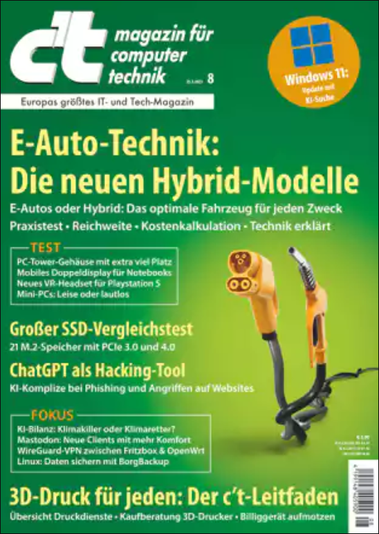 Keywords: c't, Heise, Magazin, KI, AI, ChatGPT, E-Auto, Hybrid-Fahrzeug, Hardwarevergleich, Hardwaretest, Linux