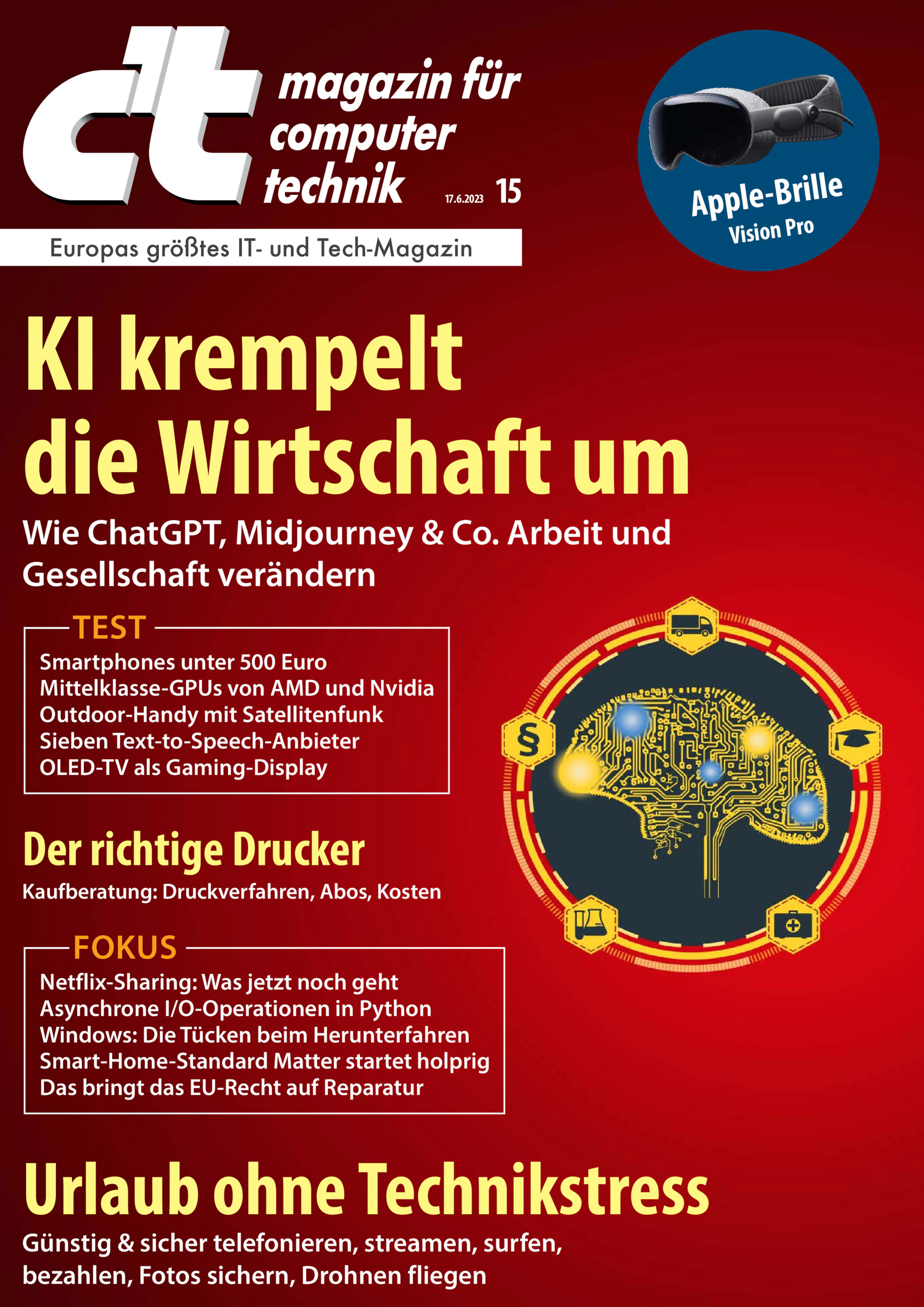 KI in der Wirtschaft: Wie ChatGPT, Midjourney & Co. Arbeit und Gesellschaft verändern Urlaub ohne Technikstress: Günstig & sicher telefonieren, streamen, bezahlen, Drohnen fliegen Drucker-Kaufberatung: Druckverfahren, Abos, Kosten Netflix-Sharing: Was jetzt noch geht Asynchrone I/O-Operationen in Python Windows: Die Tücken beim Herunterfahren Smart-Home-Standard Matter startet holprig Im Test: Smartphones unter 500 Euro, Mittelklasse-GPUs, Text-to-Speech-Anbieter, OLED-TV als Gaming-Display uvm.