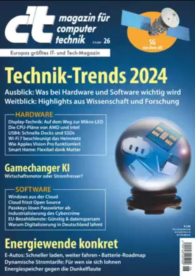 CPUs mit KI-Einheiten, Passkeys statt Passwörter, Windows aus der Cloud, Apples VR-Einstieg, Satelliten-5G-Netze für Smartphones … was ist Hype, was echter Fortschritt? Wir stellen in diesem Heft die wichtigsten IT- und Technik-Trends für die nächsten Jahre vor und klären, was für Nutzer wirklich dabei herumkommt.